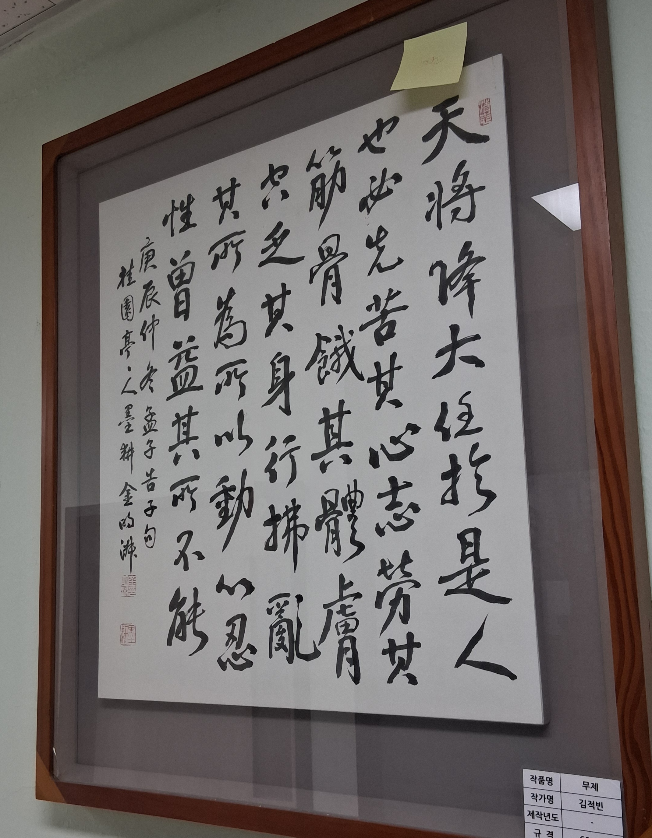 나다움실 복도 수전 근처 벽에 김적빈님의 붓글씨 액자가 걸려있습니다