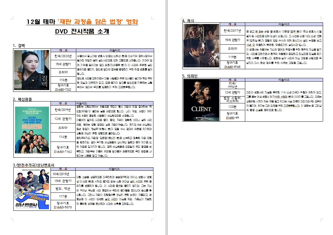 12월 테마 「‘재판과정을 담은 법정’ 영화」 DVD 전시(디지털자료실)