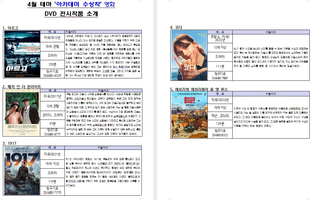 4월 테마 '아카데미 수상작' 영화 DVD 전시작품 소개 .jpg