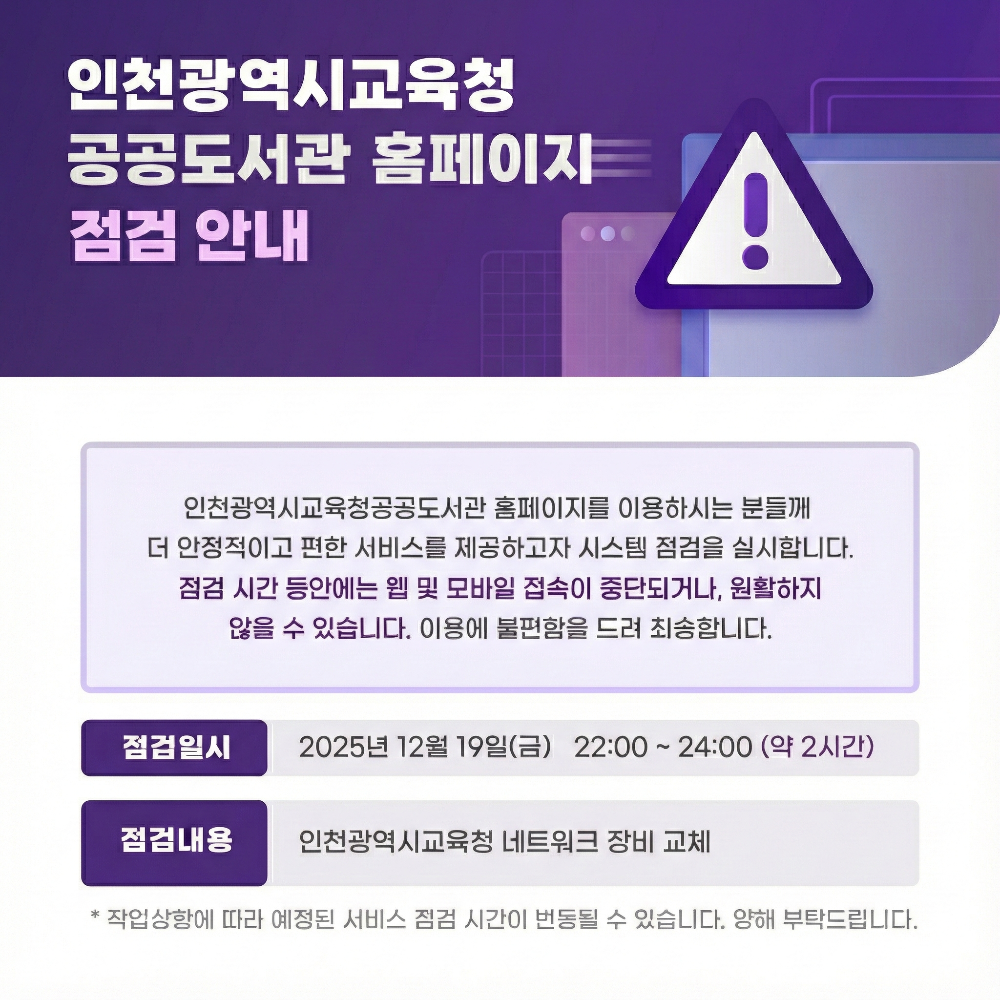 도서관 홈페이지 점검으로 인한 일시 사용 불가 안내