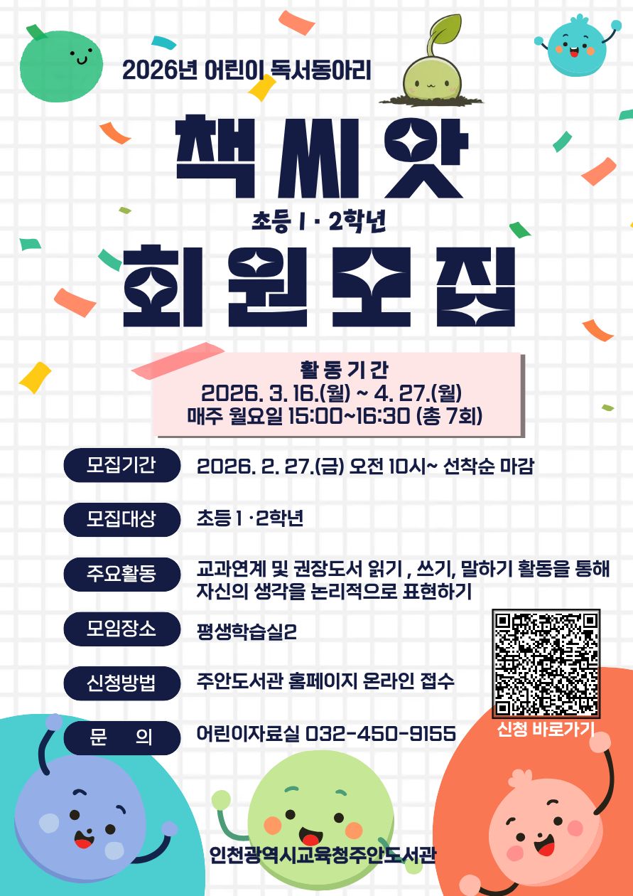 - [모집] 2026년 어린이 독서동아리「책씨앗」(초등 1·2학년) 회원 모집 안내
