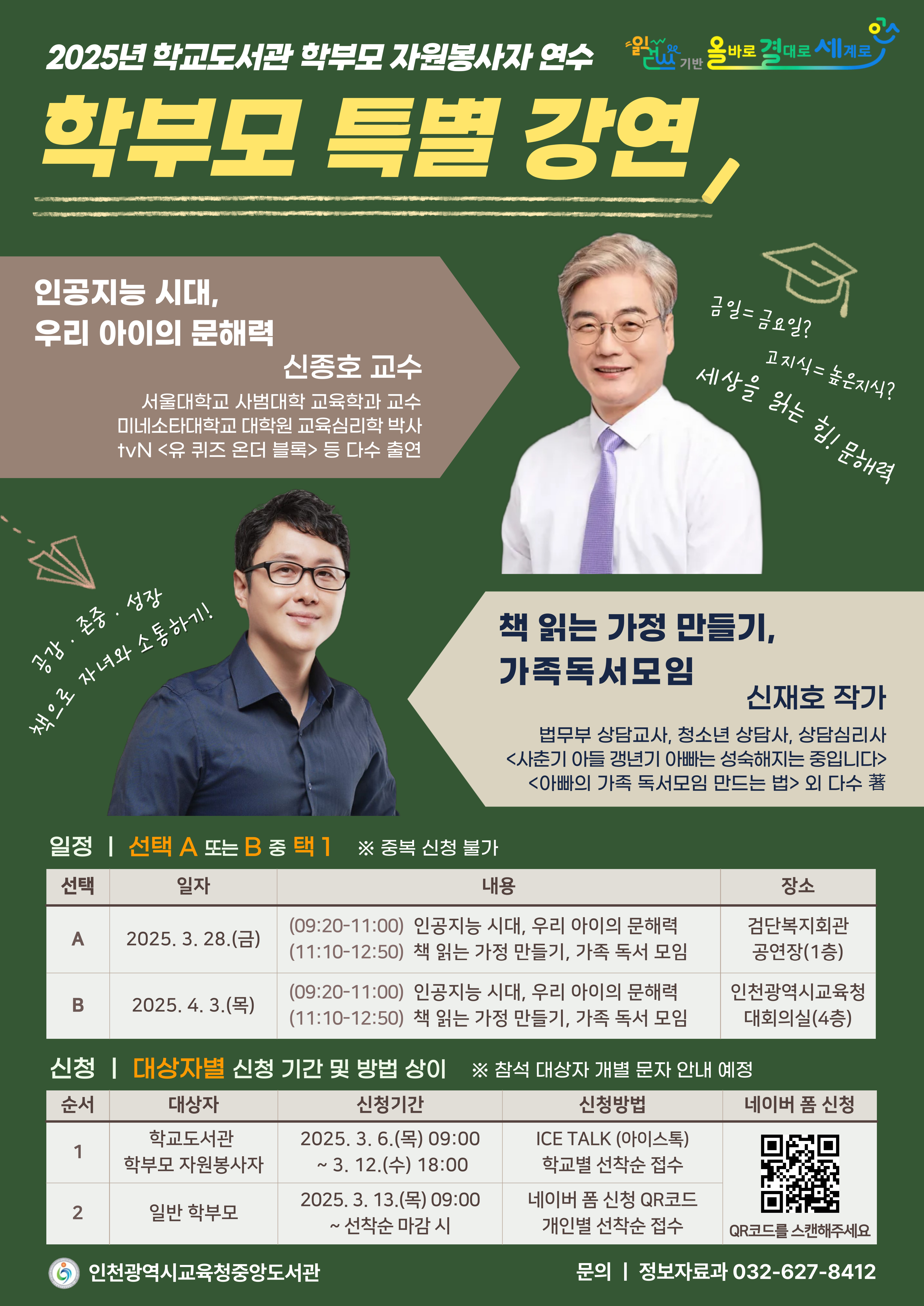 인천광역시교육청중앙도서관에서는 인천 지역 학부모님들을 위해 특별한 강연을 준비했습니다!
