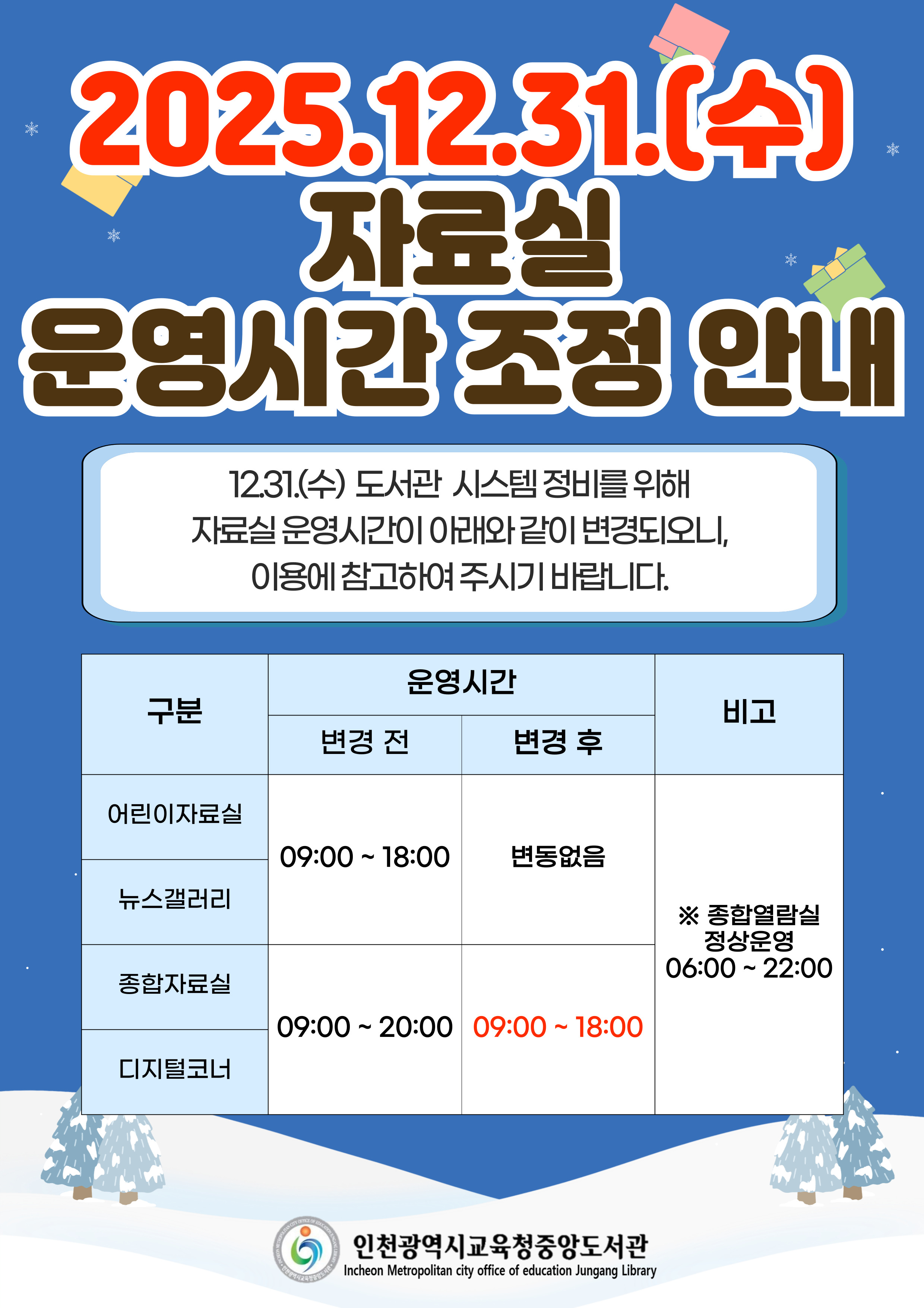 2025년 12월 31일 종합자료실 및 디지털코너 운영시간 변경 안내