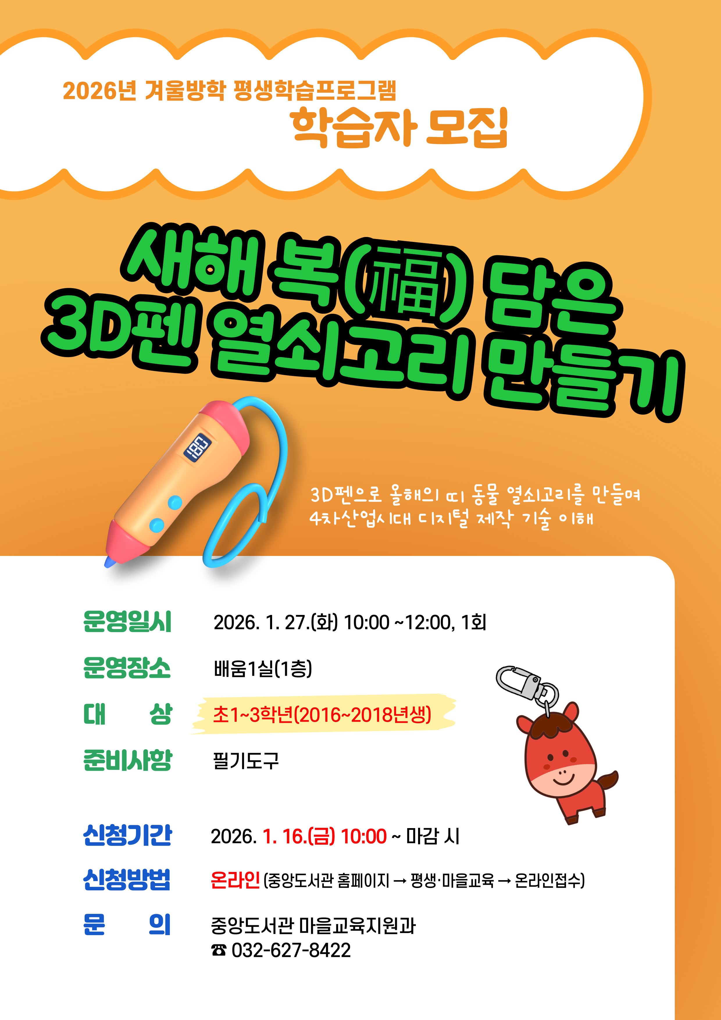 - 2026년 겨울방학 평생학습프로그램 [새해 복(福) 담은 3D펜 열쇠고리 만들기] 학습자 모집