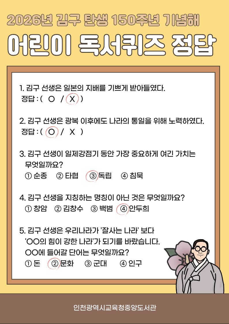 - 2026년 김구 탄생 150주년 기념해 어린이 독서퀴즈 당첨자 및 정답 발표