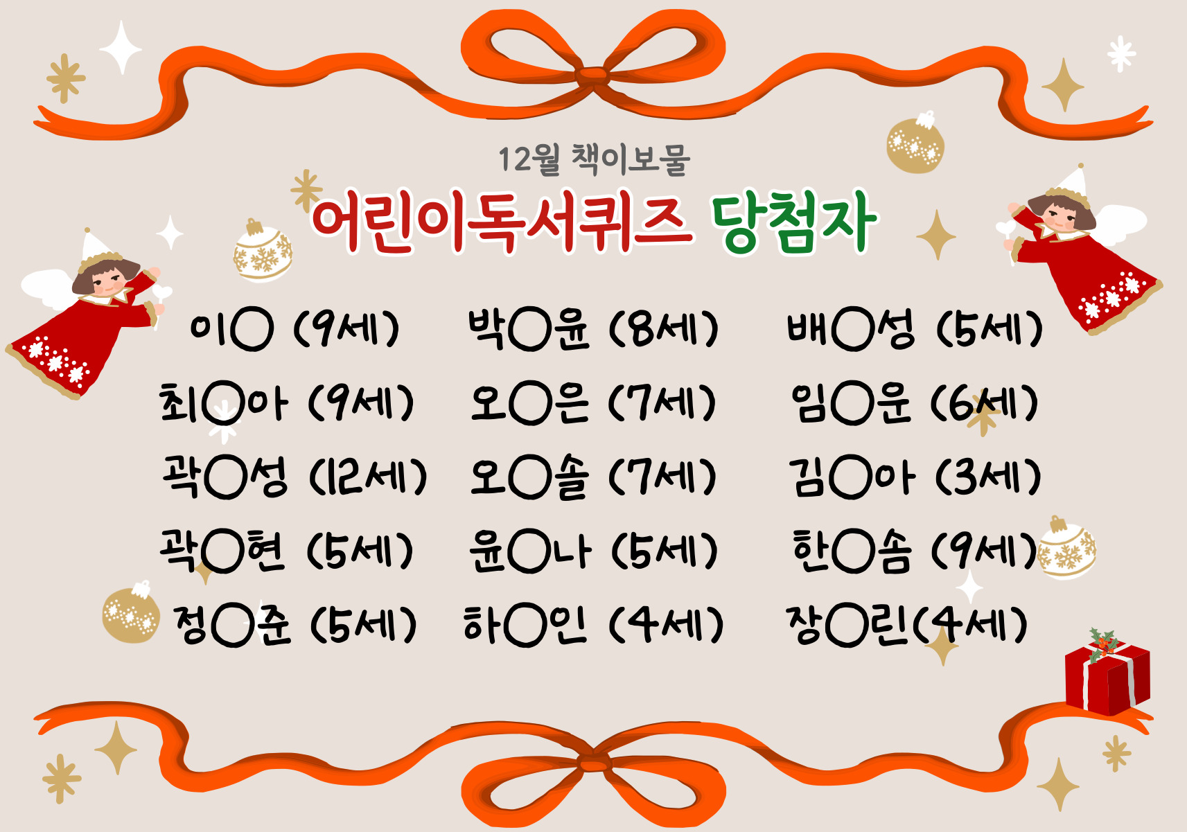 짝짝짝!!! 2025년 12월 「책이보물」 어린이 독서퀴즈 당첨자를 안내합니다.