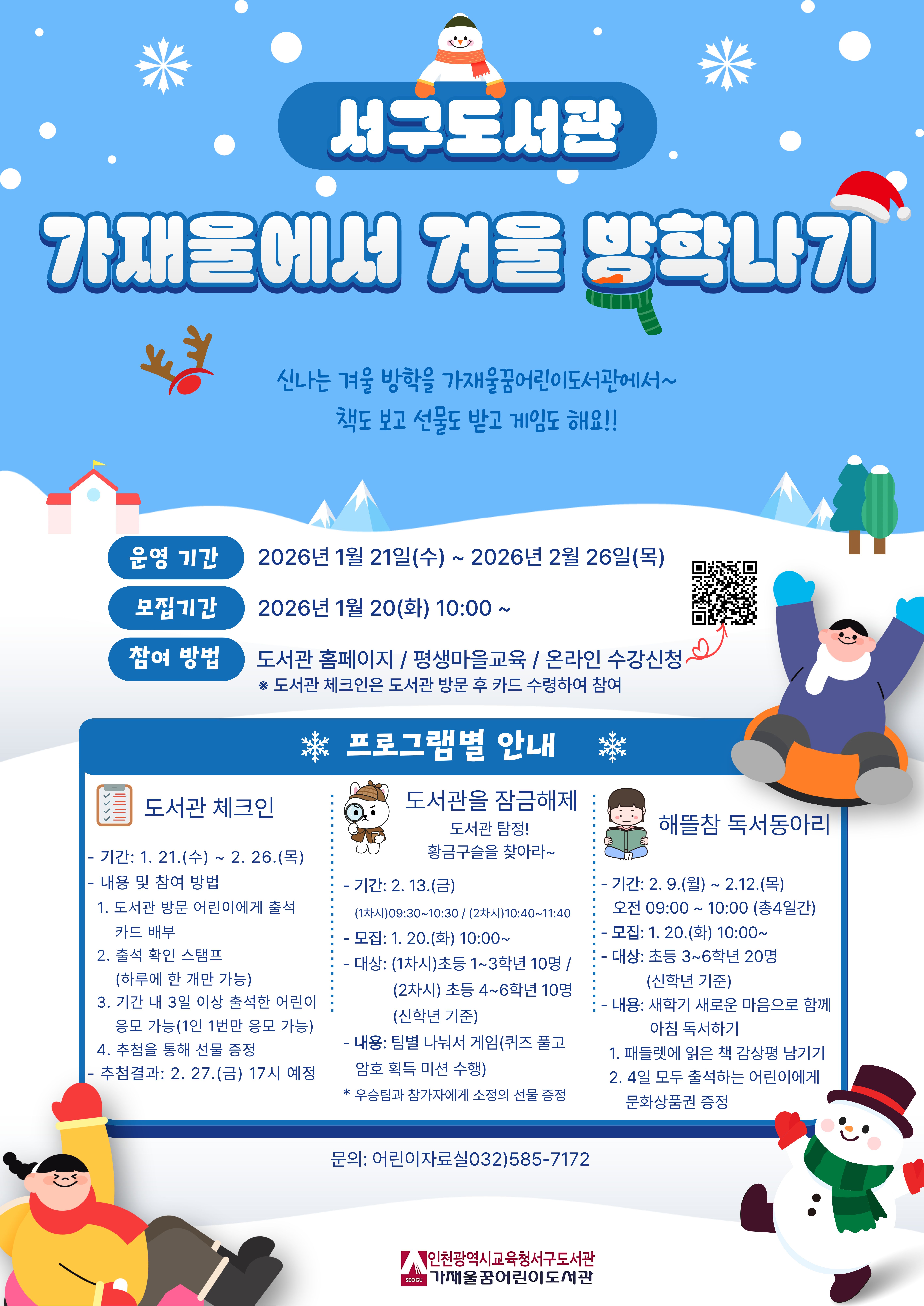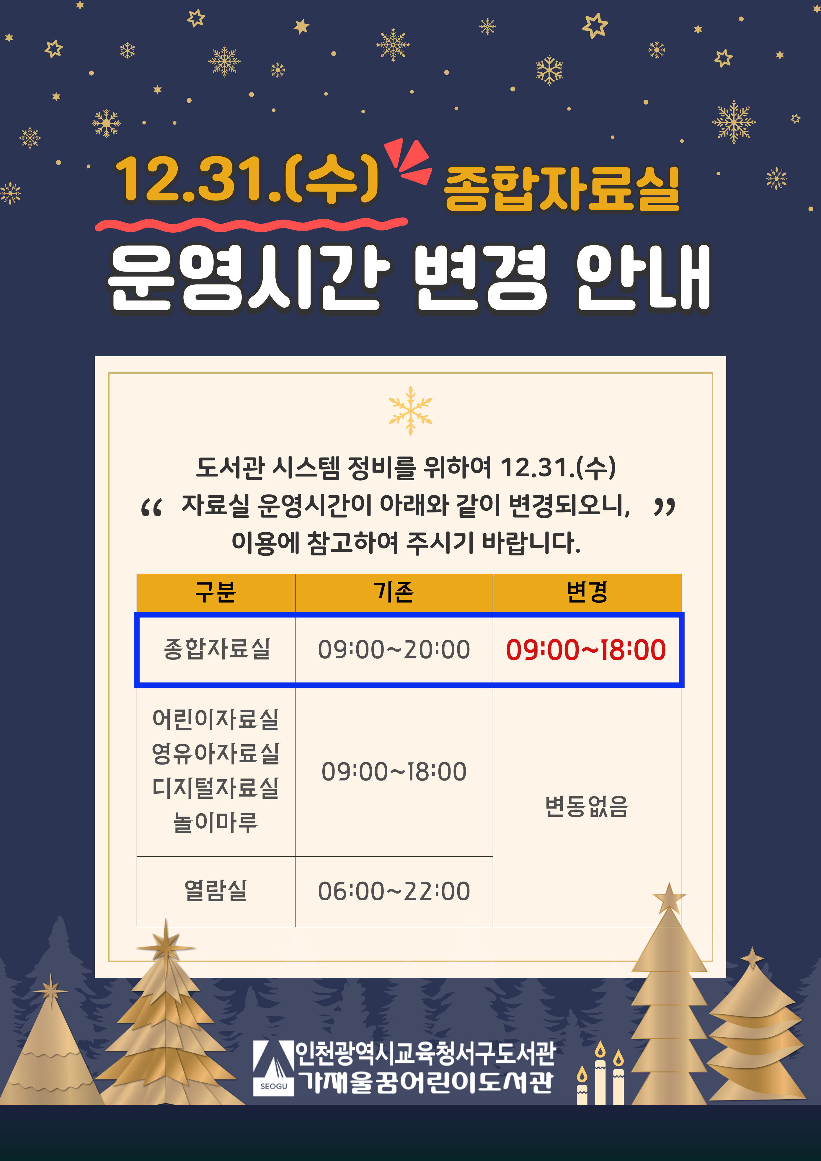 종합자료실 월~목(평일) 09:00 ~ 20:00 / 토·일(주말) 09:00 ~ 17:00 어린이자료실·영유아자료실·디지털자료실·놀이마루 월~목(평일) 09:00 ~ 18:00 / 토·일(주말) 09:00 ~ 17:00 열람실 월~목, 토·일(금요일 휴관)06:00 ~ 22:00