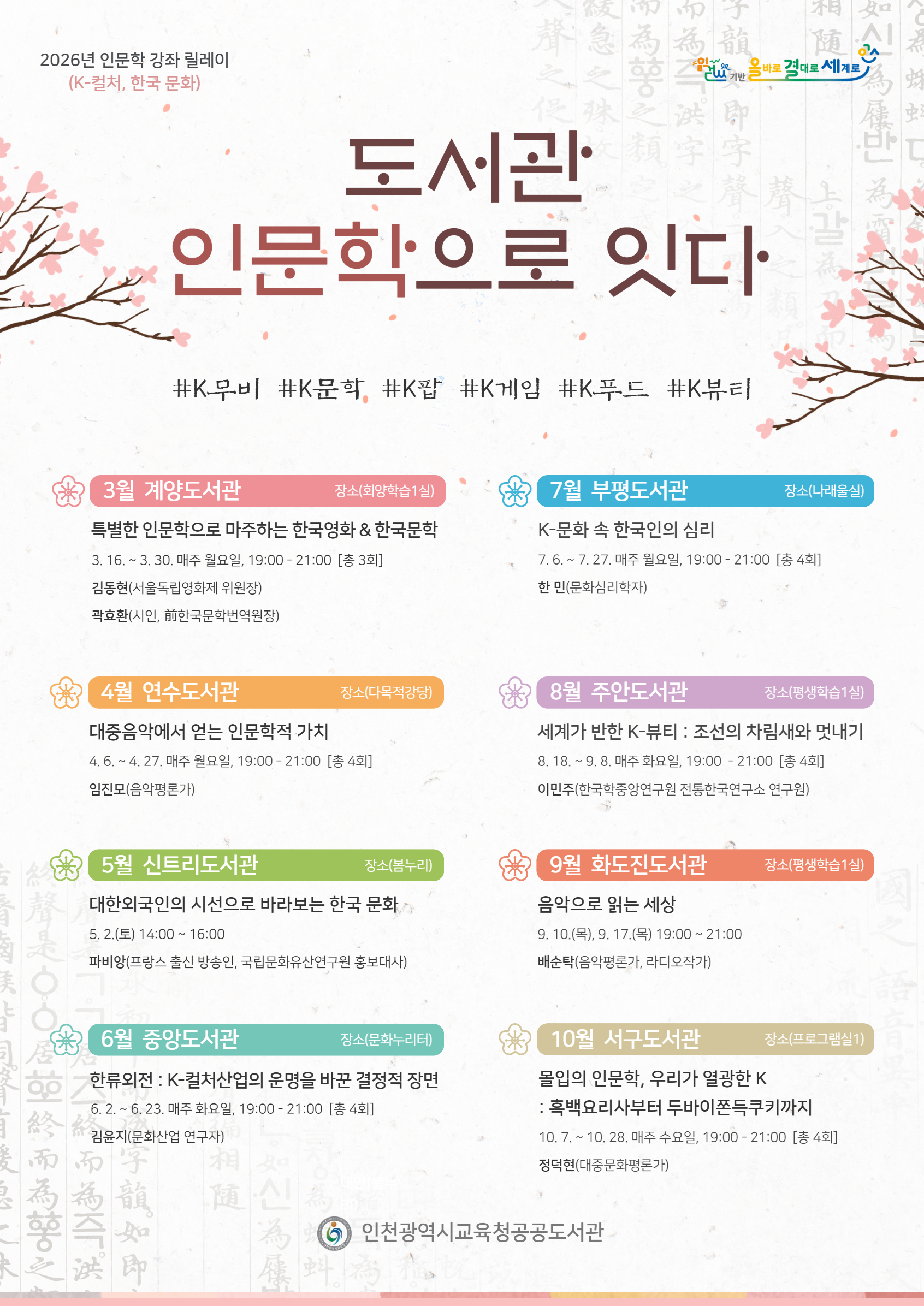 2026년 정규평생학습프로그램 강사 공개모집에 따른 최종 합격자를 붙임과 같이 발표합니다. 지원해주신 모든 강사님들께 감사 말씀 드리며앞으로도 우리 도서관 평생학...